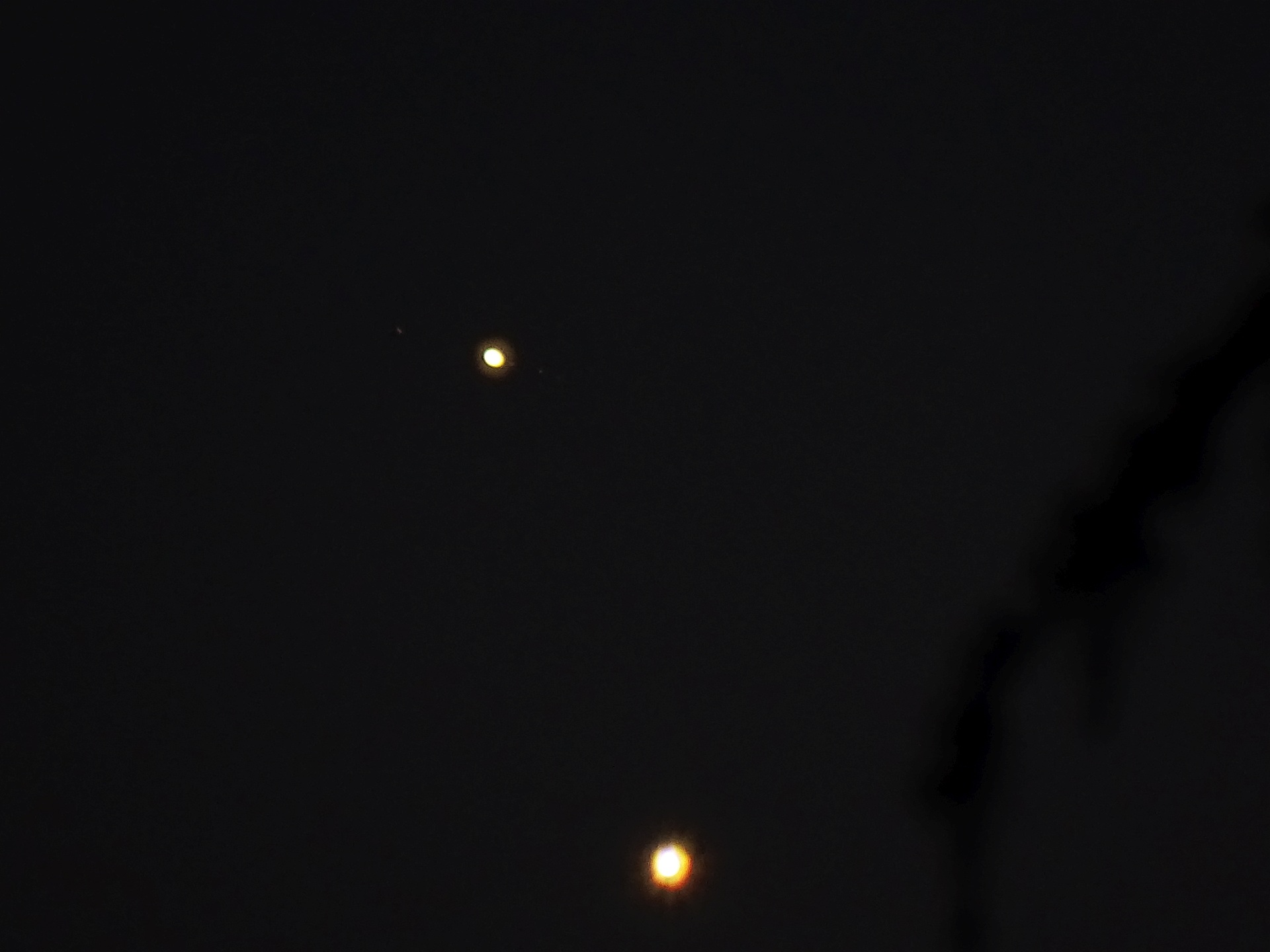 Ebenso war es nicht möglich, Jupiter auf Digibild (Nicon Coolpix S2800) abzubilden - der Kontrast zum Himmel war zu klein. Erst gegen Sonnenuntergang gelang mir das: zunächst war Jupiter nur als diffuse "Wolke" neben Venus zu erkennen (21:40 MESZ), ehe er bei etwas dunklerem Hintergrund dann deutlich erkennbar wurde.
