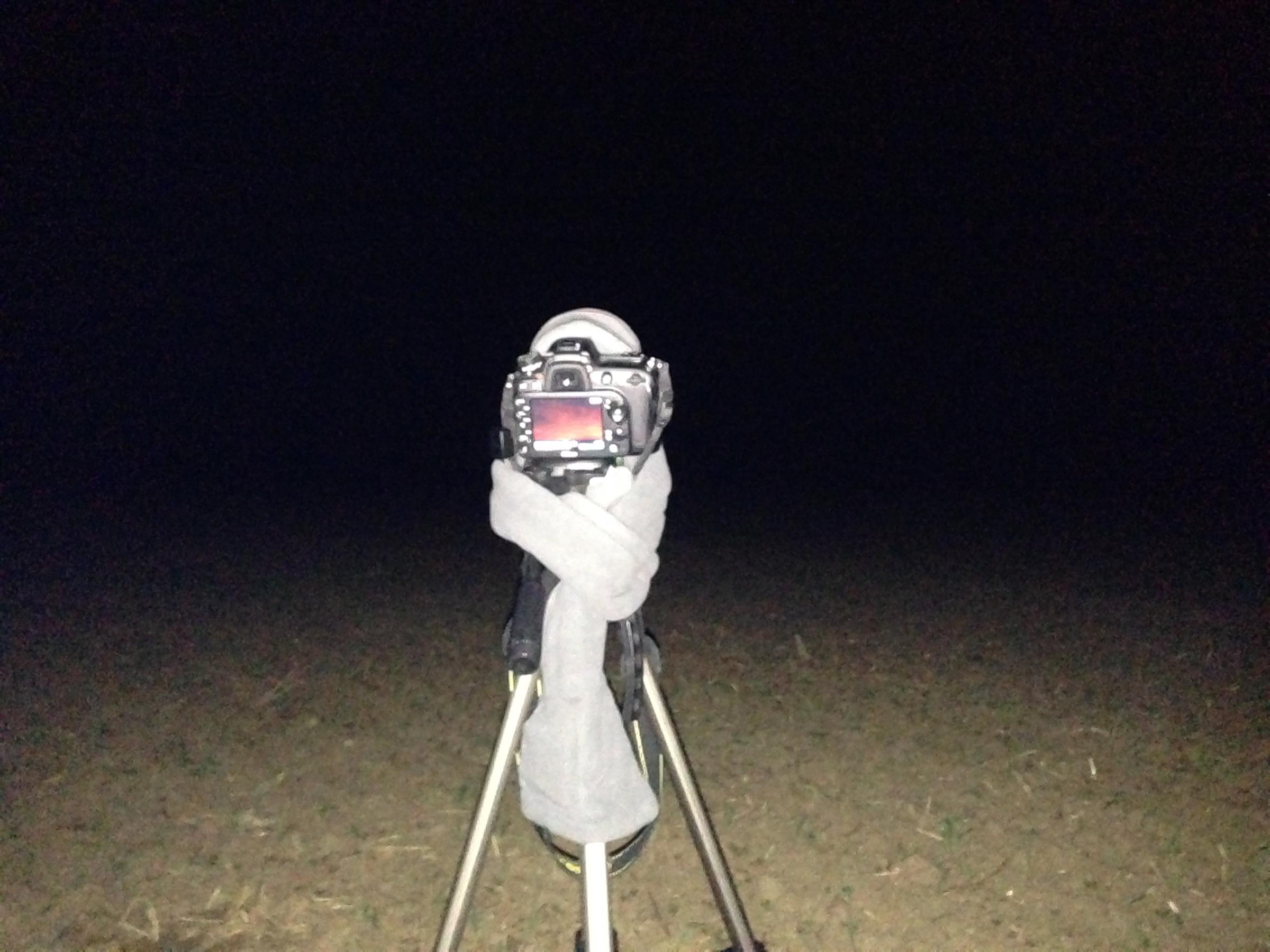 2. Gegen das Beschlagen der Linse habe ich mir vor kurzem diesen beheizbaren Schal zugelegt, sicher etwas provisorisch, aber es funktioniert ganz wunderbar und kann mit AA-Batterien betrieben werden:
