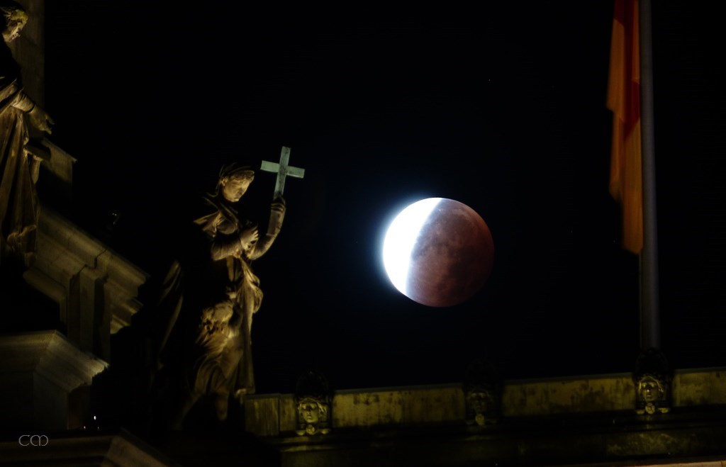Aufnahmen posten, welche den maximal verfinsterten Mond gemeinsam mit der romanischen Kirche