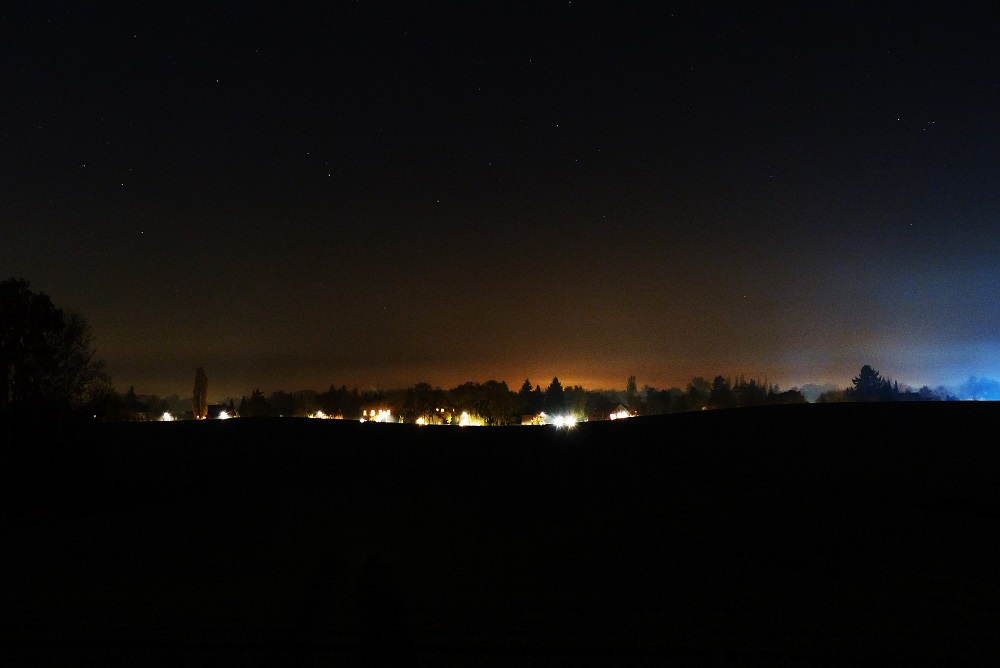 Ich bin mir ziemlich unsicher... Wir wollten erst aus Berlin Richtung Linum fahren, aber je weiter wir nach Norden kamen desto dicker wurde der Nebel. Dann sind wir umgedreht und haben wir nur ein paar Bilder in Lübars gemacht - Belichtung war 15 Sekunden bei ISO 400 zwischen 22.15 und 22.40 Uhr, Kontrast nachträglich erhöht. Rechts war hinter dem Hügel irgendein starker Scheinwerfer, das in der Mitte ist sicherlich auch Lichtverschutzung, aber das grünliche? War mit bloßem Auge nicht zu erkennen, nur auf den Fotos. Aber ich bin nicht sehr optimistisch dass das wirklich was ist, es war einfach zu diesig...
