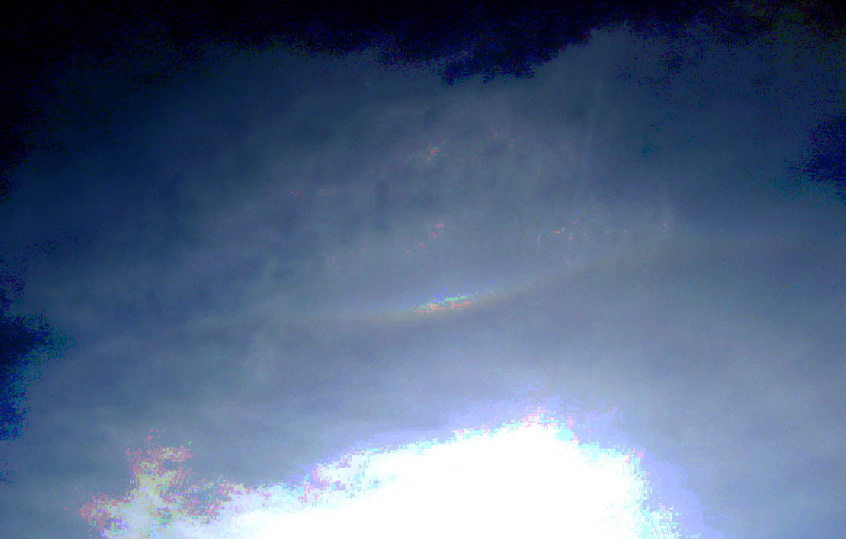 Gegen 13.30 Uhr verschwanden die Halos, bis auf den ZZB. Dieser blieb noch bis 15.30 Uhr sichtbar und war gegen 15 Uhr recht auffällig (H=2). Zu dieser Zeit war ich in Castrop-Rauxel, wo auf einer alten Abraumhalde als Landmarke eine große Sonnenuhr steht, auf der die Stunden als hohe Metallsäulen dargestellt sind. Dort konnte ich ihn als bunte Brücke zwischen zwei dieser Stundensäulen fotografieren: