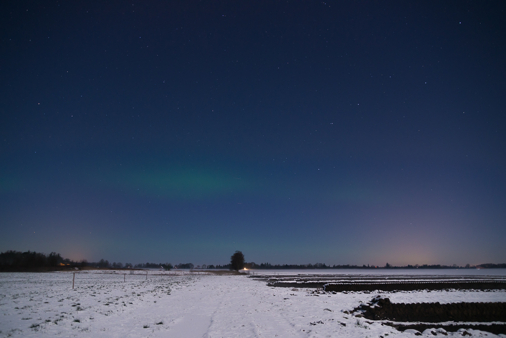 vielen Dank für die Meldung! In St. Peter-Ording kam ich kurz nach 19 Uhr nach draußen. Auf dem Weg mit dem Fahrrad zum Deich an die Tümlauer Bucht waren bis auf Höhe der Deichsel des Großen Wagens immer wieder helle Flecken zu sehen, die ich aber für vom Mondlicht erleuchtete Wolkenschleier hielt. Sonst hätte ich sofort in Nähe des Ortes schon das Stativ aufgebaut. Am Deich stellte sich dann bei den beiden ersten Fotos heraus, dass diese im Bild grünlichen Schimmer zum "oberen Bogen" des Polarlichts gehörten. Leider waren es in der Höhe die letzten. Danach war der untere Bogen in unterschiedlicher Stärke noch bis nach 22 Uhr zu sehen. Später war nicht mehr klar, was Polar- und was Mondlicht war.