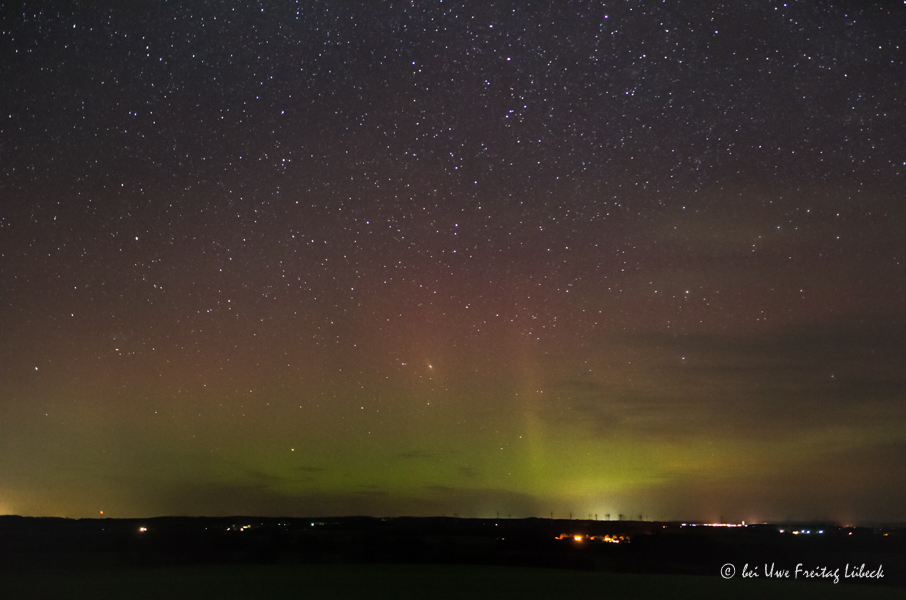 ich wurde am späten Abend auf die interessanten Sonnenwindwerte aufmerksam und entschloss mich, nach Abzug der Wolkenfelder, noch aufs Feld rauszufahren (nördl. von Sellstedt). Vor allem auch weil da schon die Magnetometer in Skandinavien ordentlich ausschlugen. Gleich mit der ersten Aufnahme um 1:10 MEZ war das PL fotografisch ohne Probleme auf dem Kamerabildschirm sichtbar.