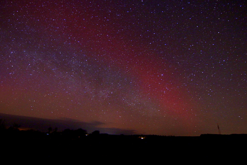 Auch ich habe mich mal wieder auf die Suche nach einem dunklen Standort im Berliner Umland gemacht und bin dann am Grubensee in der Nähe von Limsdorf bei Storkow und in näherer Umgebung gelandet. Zwischen 22:20 und ca. 0:00 Uhr Ortszeit konnte ich zuerst fotografisch und später auch visuell Polarlicht bestaunen. Der rote diffuse Bogen war auch bei mir fotografisch zu erahnen.