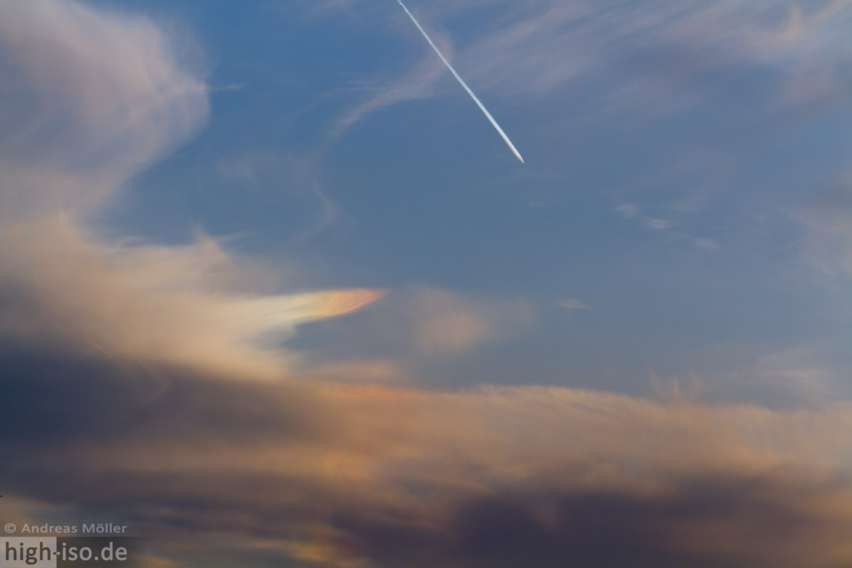 Später dann eigenartig dichte, tiefere, cirrusartige Fetzen, die auch Eigenschatten zeigten. Dazwischen nochmal diese etwas eigenartige langgezogene Nebensonne (oder Ringfragment):