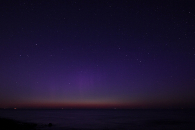Nach jahrelanger Jagd konnte ich letzte Nacht zwischen 00.00 und 00.45 Uhr dieses leicht visuelle Polarlicht an der Westküste von Sylt aufnehmen. Die Beamer waren visuell schwach zu erkennen.