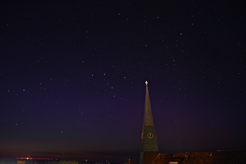 Dann werde ich meine Sichtung auch hier mal zeigen, konnte fotografisch gegen 23:32 Uhr MESZ (21:32 Uhr UTC) Polarlicht einfangen über der Stadt.