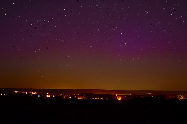 Ich war am Abend auch draußen in Götzberg. Das Polarlicht war zwischen 23 Uhr MESZ bis kurz vor Mitternacht schön fotografisch nachweisbar mit violetten Beamern. Visuell sehr schwach an der Grenze des Sichtbaren. Fotos folgen am Abend.