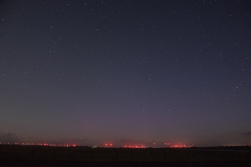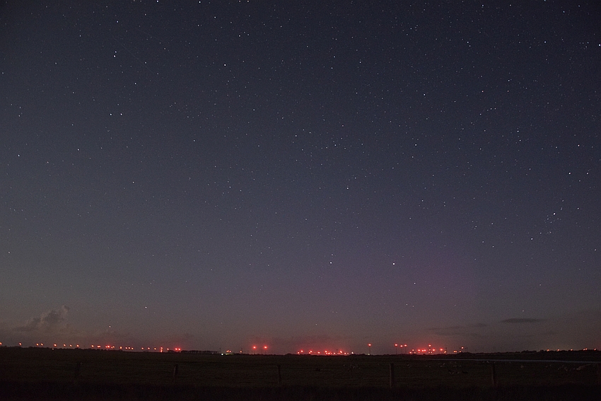 nachdem ich bei Michael auf der Webcam den "komischen" violetten Fleck sah und die PL-Intensität im Diagramm auf visuell stieg, bin ich schnell zu meinem bevorzugten Standort und habe PL fotografisch nachweisen können. Bis 00:30 UT war auch vernünftig mit der Kamera zu erfassen. Ich habe dann noch bis 01:00 UT weitere Aufnahmen gemacht, aber die Dämmerung störte dann schon von Osten her. Außerdem war Schlafanzug mit Jeans und dünner Jacke drüber nicht die geeignete Kleidung um im nasskalten Wind länger zu warten.