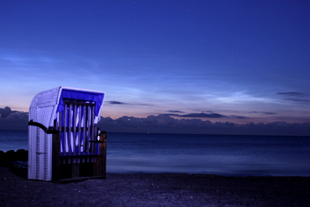 Nachdem auf den Webcams eindeutig NLC sichbar wurden bin ich 'raus zur Ostsee. Diesmal nicht Hubertsberg, sondern zum Behrensdorfer Strand (54,21°N, 10,36°O), weil es dort Strandkörbe gibt und ich es etwas gemütlicher haben wollte und ein Frosch-/Vogelkonzert vom Naturschutzgebiet Binnensee ist auch noch dabei.