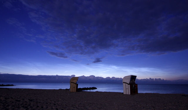 Nachdem auf den Webcams eindeutig NLC sichbar wurden bin ich 'raus zur Ostsee. Diesmal nicht Hubertsberg, sondern zum Behrensdorfer Strand (54,21°N, 10,36°O), weil es dort Strandkörbe gibt und ich es etwas gemütlicher haben wollte und ein Frosch-/Vogelkonzert vom Naturschutzgebiet Binnensee ist auch noch dabei.