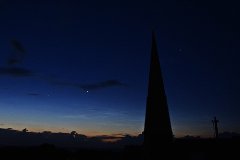 Ich habe heute gegen kurz nach Mitternacht (als das Hupkonzert losging :mrgreen:) ebenfalls schwache NLCs einfangen können. Leider war der Himmel nicht bis zum Horizont komplett wolkenlos und die Eisschirme der Gewitter über der Nordsee haben hier ein bisschen die Sicht verdeckt.