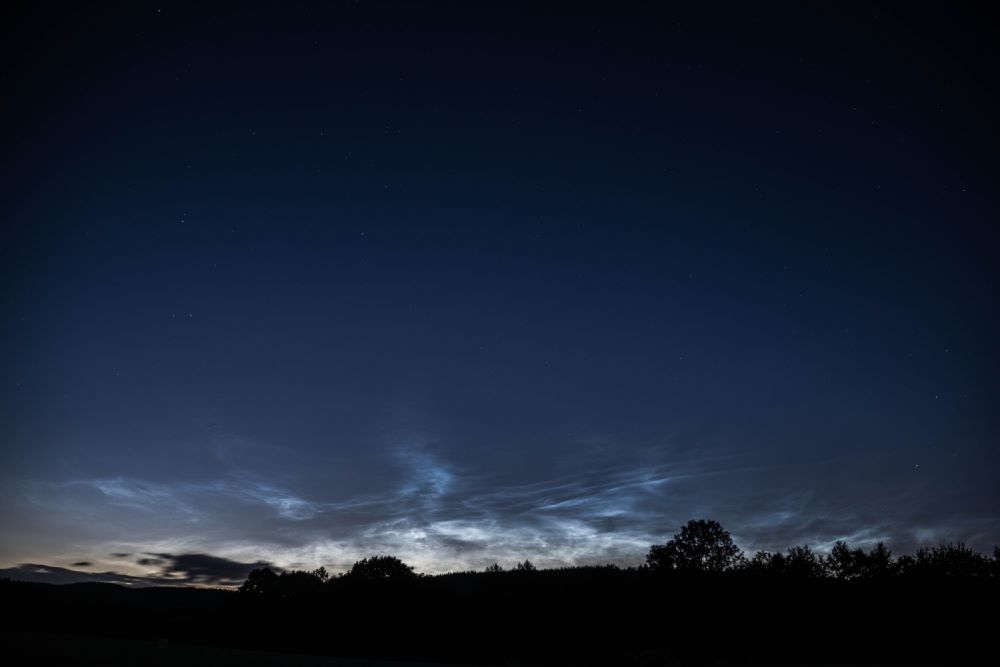 ja, was soll man sagen… ein NLC-Abend der Extraklasse! ! Die Kumuluswolken bildeten zunächst einen eindrucksvollen Kontrast zu den NLCs, bevor letztere von ersteren komplett im weiteren Verlauf verdeckt wurden… Höhe über dem Horizont um die 12° bis 15°…! Die ersten Linien und Rippen wurden noch während der hellen Dämmerung sichtbar!