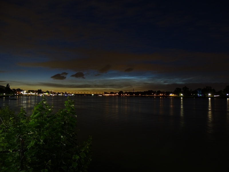 auch ich war dank der Meldung bei Facebook direkt mal draussen unterwegs und konnte von 22:55 Uhr an erste Leuchtende Nachtwolken beobachten. Diese waren sehr einfach mit dem bloßen Auge zu sehen und zeigten wunderschöne Strukturen beim Einsatz von bis zu 300mm. Standort war 50126 Bergheim westlich von Köln. Mit zunehmender Uhrzeit zogen sich diese dann immer weiter in Richtung Horizont zurück und waren bis gerade eben um 00:30 Uhr, wo ich einen letzten Blick auf sie warf, immernoch gut mit dem bloßen Auge zu erkennen.