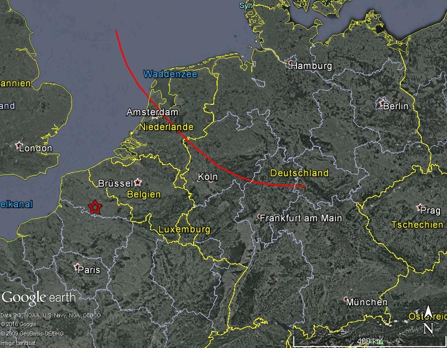 Wenn man für die NLCs eine Höhe von 82km annimmt, müsste die vordere Kante des Feldes zur o.g. Uhrzeit zentral über den Niederlanden, zentral über NRW, Nord/Mittelhessen bis nach Thüringen rein verlaufen sein. In der Zeit danach zügig weiter nach Süd-West ausgreifend. Der rote Stern kennzeichnet den Standort Wancourt.