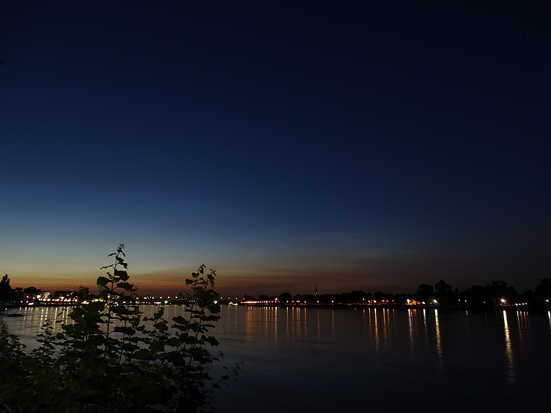 nachdem sich schon früh an einigen südlichen Cams ausgedehnte NLC-Displays gezeigt hatten, waren die Erwartungen auch hier in Bonn hoch. Tatsächlich tauchten pünktlich zum Ende der bürgerlichen Dämmerung gegen 22:20 MESZ 2 schwache Streifen recht hoch (etwa 30°) im Norden auf. Wir sind dann sofort zu einem der Beobachtungspunkte am Rheinufer geeilt. Dort stellte sich allerdings eine ziemliche Enttäuschung ein: ein diskontinuierliches, diffuses und extrem lichtschwaches Display (Helligkeit 1), welches im Laufe der nautischen Dämmerung auch nicht an Helligkeit zunahm (Abb. 1-4). Zur Frustbekämpfung habe ich dann noch ein Schiff (Abb. 5) gewarpt und einen Iridium-Flare abgelichtet (Abb. 6). Von den NLCs gibt es auch einen Zeitraffer (https://www.youtube.com/watch?v=f88ztCIFvvE), der leider viele Farbabrisse zeigt - ich hab in Erwartung eines "großen" Displays zu hoch in den Himmel gehalten - und ausgedehnte, homogene blaue Flächen sind nicht gerade die Stärke der Digiknipse. Immerhin, in HD abgespielt sind die NLCs erkennbar.