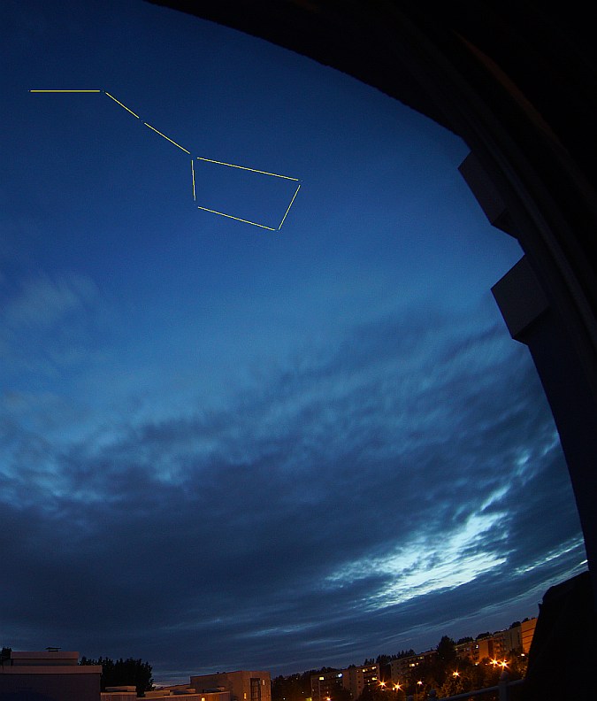 So schöne NLC wie letzte Nacht habe ich hier noch nicht gesehen. Um 4.15 Uhr MESZ = 3.15 Uhr MEZ waren sie noch ein wenig klein, da weit weg: Mit etwas Zoom: Das NLC-Feld zog recht schnell in Richtung SW, also auf mich zu. Um 4.30 Uhr Sommerzeit reichten sie schon bis fast in den Zenit, wurden aber in der Dämmerung auch blasser: So hoch reichende Leuchtende Nachtwolken habe ich hier bisher noch nicht beobachtet.