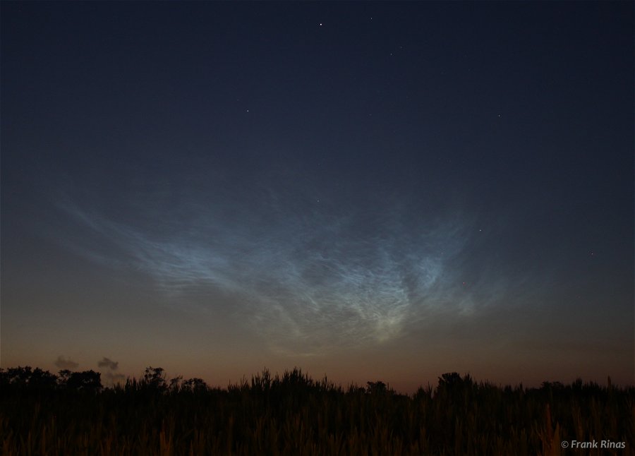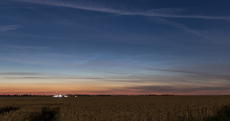 Dort angekommen zeigte sich gegen 4 Uhr ein auffälliges wenn auch eher kleinräumiges NLC Display. Dies hatte zu diesem Zeitpunkt nur eine Höhe von 11°, zeigte aber rasch erste schöne Strukturen. Zudem nahm es ebenfalls recht schnell an Helligkeit zu. Die maximale Helligkeit war glaub ich so gegen 04:15 Uhr erreicht. Das Display gewann zunehmend an Höhe (04:22 Uhr schon maximal ~31°) und auch die Ausdehnung nahm zu. Man konnte schön erkennen wie sich die NLC von Nordosten nach Südwesten ausdehnten. Um 04:39 Uhr betrug die maximale Höhe schon ungefähr 56°, aber es hatte natürlich an Helligkeit eingebüßt. Die Ausdehnung lag bei ungefähr 354° bis 75°, passte daher nicht mehr auf ein Foto. Die letzte Beobachtung mit noch mehr Ausdehnung und Höhe machte ich gegen 05:03 Uhr. Nun noch ein paar zusammenfassende Daten: