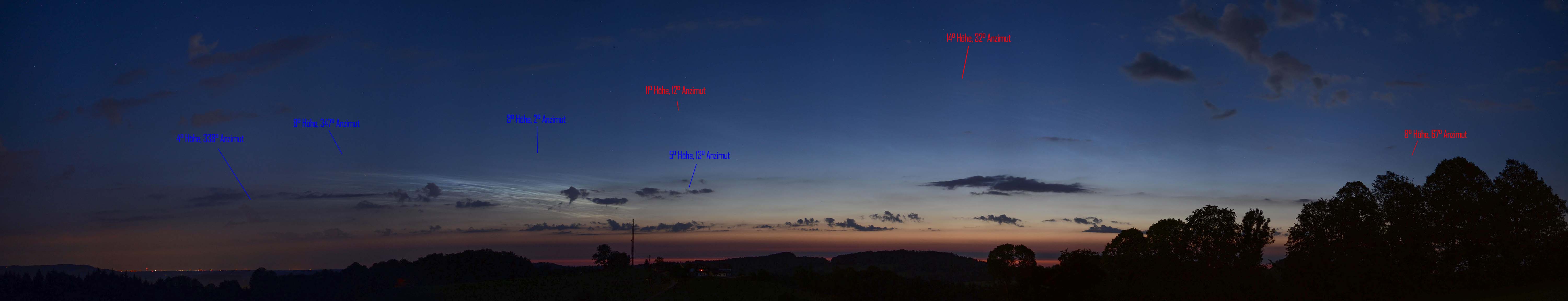 @Stefan, falls du es für die Auswertung brauchst, kann ich die maximale Höhe und Anzimut der 2 Felder auch nochmal getrennt angeben. Die östlichen NLCs waren viel Höher, aber auch viel schwächer. Im Lauf der Dämmerung verschwanden die östlichen NLCs, während die hellen weiter nach Nordwesten zogen.