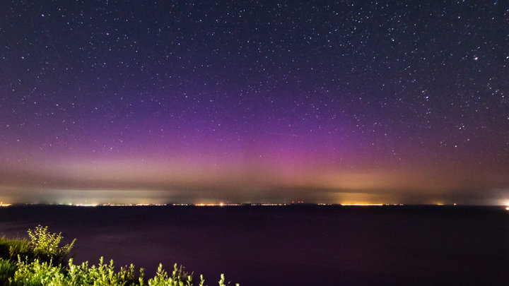 00:10 MESZ bei Kiel (Strande) bei Blick auf die Ostsee deutlich Violette Verfärbung / violettes Leuchten erkennbar.