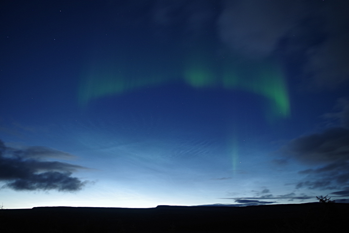 Dies war meine späteste NLC-Sichtung seit Beobachtungsbeginn 1995 (zuvor am 22./23.8.2002 auf der Halbinsel Kola, Russland). In diesem Jahr hatte ich die Gelegenheit, die gesamte NLC-Saison auf dem 69sten Breitengrad mitzuverfolgen. Sie begann trotz heller Nächte bereits am 6./7.8. mit deutlich abgegrenzten Schlieren und Bändern, die im Bereich des Erdschattens vom Zenit bis zum Südhorizont reichten, und endete am 25./26.8. mit dem ersten Polarlicht bei inzwischen astronomischer Mitternachtsdämmerung.