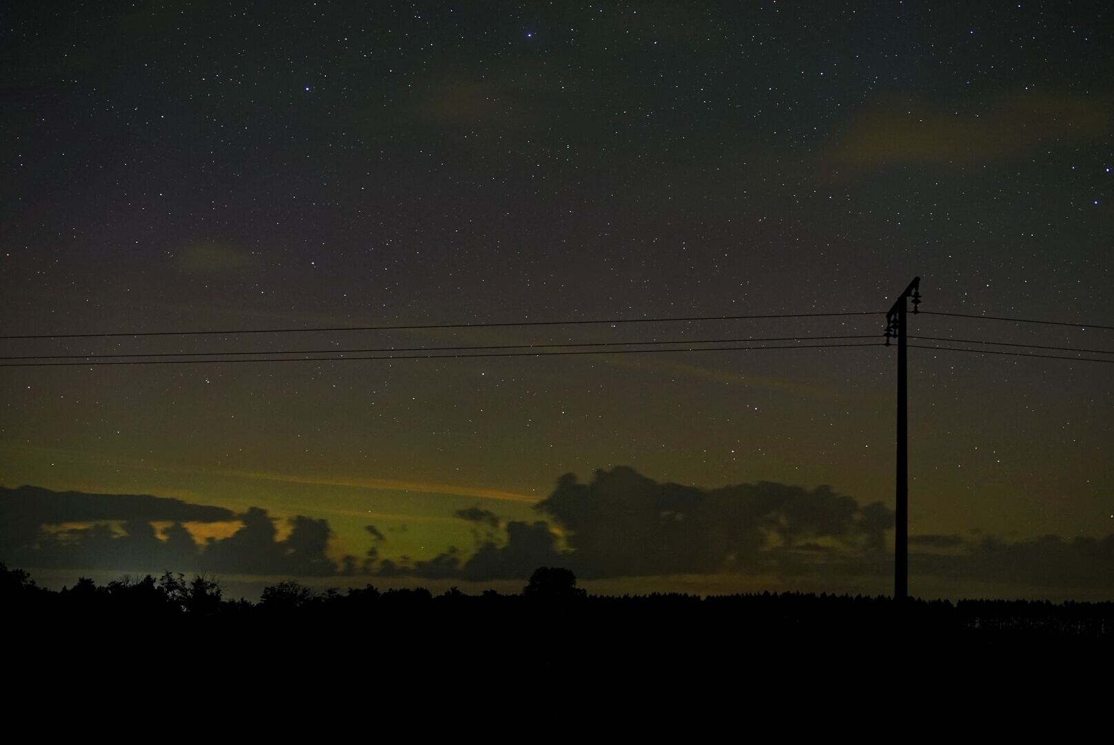 War zunächst von 20:30 UTC-22:00 UTC draußen. Außer sehr bescheidenem fotographischem PL war nichts..."Belegfoto" mit fotographischem PL, etwas Airglow und einem Meteor hänge ich 'mal 'dran.