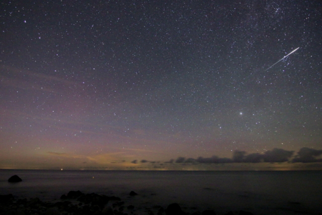 Aufnahme von 01:28 Ortszeit ( Entweder mit zwei gegenläufigen Meteoren oder mit 2 Iridium-Flares