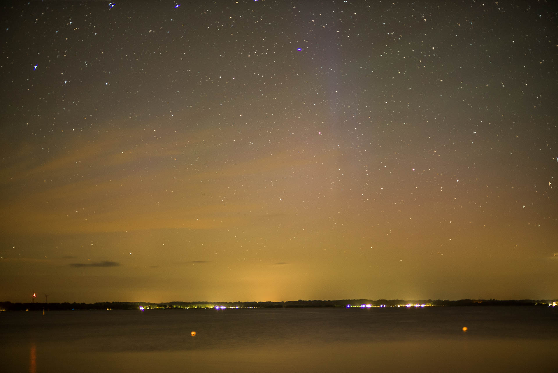 ich habe letzte Nacht einen neuen Beobachtungsplatz ausprobiert. Für die Aufnahmen war ich nach Lindhöft bei Eckernförde gefahren. Von 22:50 - 2:58 Uhr MESZ konnte ich mehrere Substorms erleben und aufzeichnen. In Spitzenzeiten war eine Aufhellung am Horizont zu erkennen, sowie die großen und hellen Strahlen hoben sich vom Hintergrund ab. Störend war das Licht vom nahen Campingplatz und die Beleuchtung am anderen Ufer der Förde.