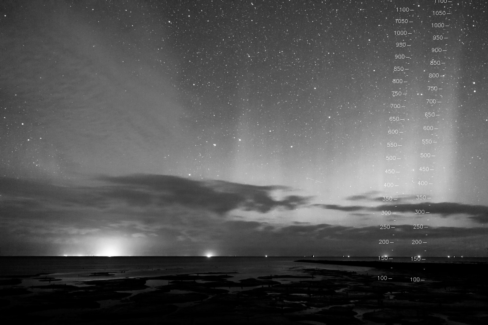 Im Bildpaar von Carsten und mir vom 1.9.2016 um 23:14:17 UTC ist zwar kein solcher Strahl, es eignet sich aber, die Lage des Polarlichtovals und die Höhe des Polarlichts abzusichern. In diesem Fall ist zu erkennen, dass das grün bis 200 km Höhe reicht (so wie es sein muss) und danach das PL in rot übergeht. Das passt also: Gegen 2:25 UTC gab es den am höchsten reichenden Strahl. Jedenfalls war er in allen meinen Aufnahmen bei weitem der längste. Leider gibt es zu diesem Strahl keine Vergleichsbilder im Forum. Da sich die Lage des Polarlichtovals in der Nacht aber offenbar nicht groß geändert hat, habe ich für diesen Strahl einfach die entsprechende Entfernung verwendet. Falls das so stimmt, kommt ein Wert von über 1400 km heraus: Nur Blaukanal: