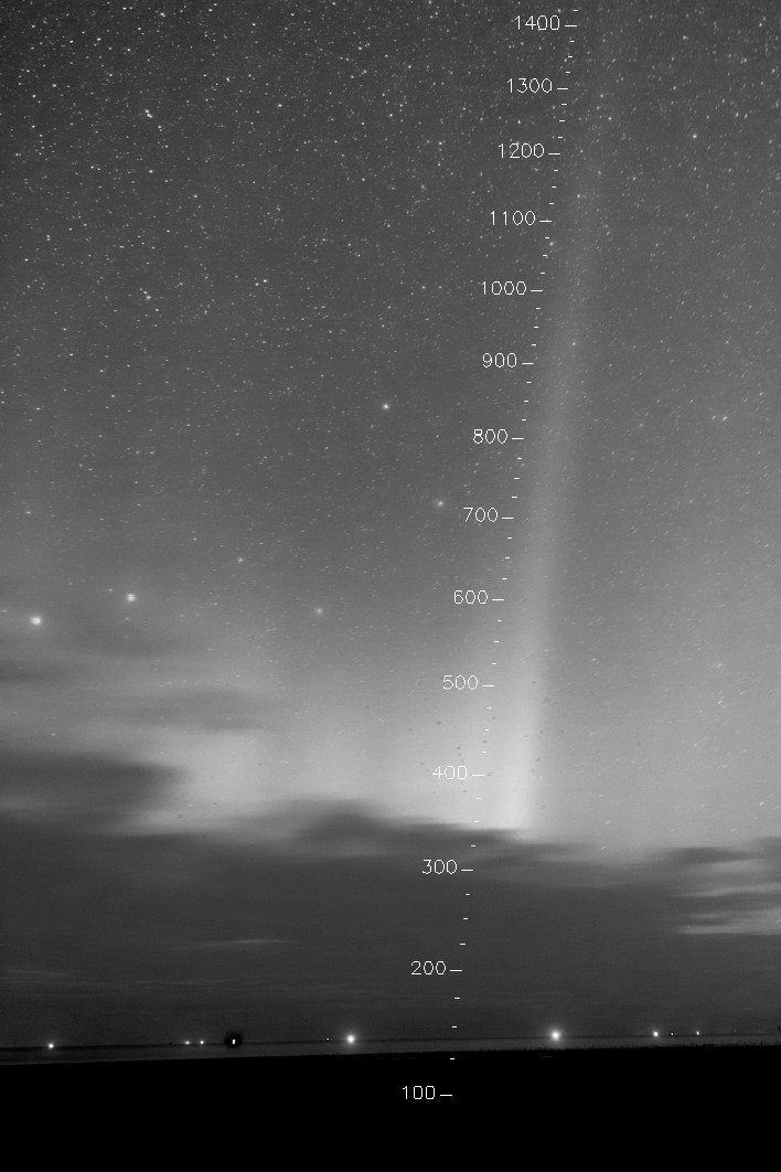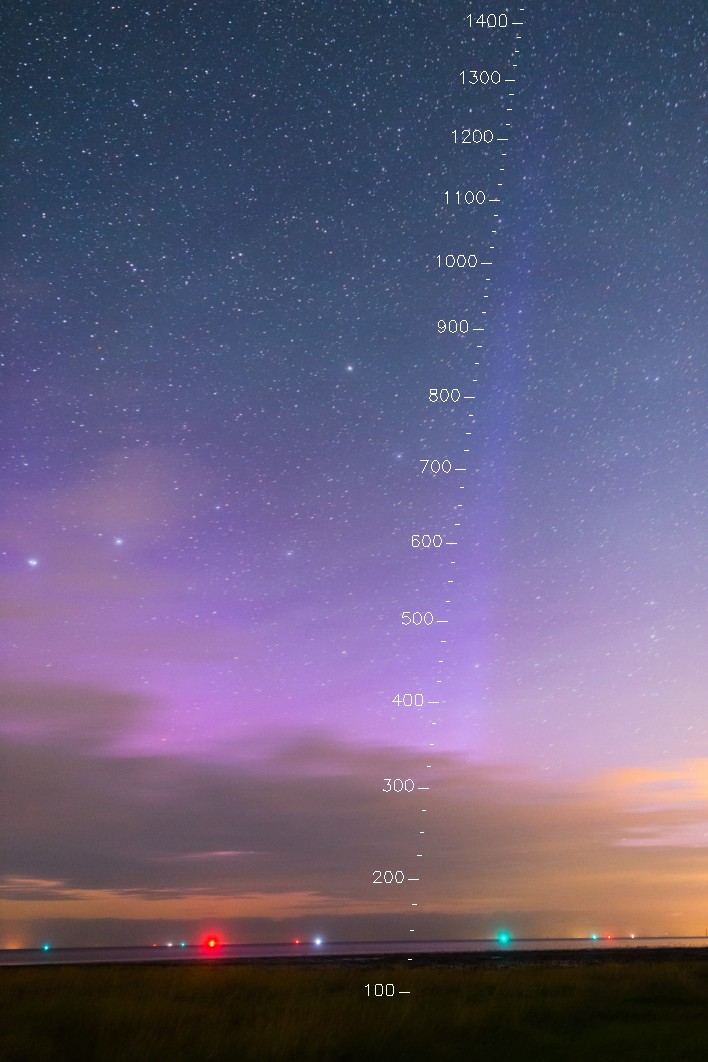 Das ist natürlich eine ganz außergewöhnliche Höhe. Inzwischen sind aber weltweite eine ganze Reihe solcher Ereignisse dokumentiert. In Westaustralien gab es vor 1-2 Jahren blaue Strahlen, die dank vieler Aufnahmen bestens referenziert werden konnten und 2000 km Höhe erreichten.