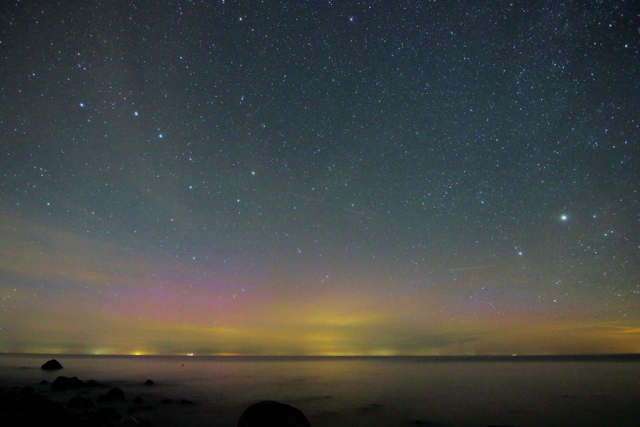 Hier ebenso schwach visuell. Fotografisch vorhin toller Strahlenvorhang! Inzwischen schwächer aber rotes Glimmen weiterhin vorhanden.