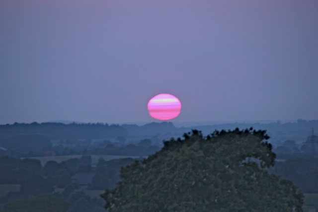 Den Sonnenaufgang konnte ich nicht sehen, erst als ich wieder fahren wollte, sah ich sie schon relativ hoch aber noch knallrot im Dunst stehen.
