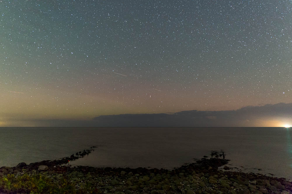 mein erster Standort war Oldenburg, da konnte ich ab 19:35 MESZ auch gleich schwaches fotografisches PL festhalten. Leider war nach etwa 1 Stunde dank Nebel nix mehr zu machen. Bin dann nach Hooksiel gefahren, mit der Hoffnung, daß es da vielleicht besser ist. Na ja, Polarlicht konnte ich auch hier fotografisch erhaschen. Genau Richtung Norden war ein Baggerschiff, was extrem hell war. Ohne Dunst und Schiff hätte man das PL vielleicht auch sehen können. Um 00:00 MESZ ging es Richtung Heimat.