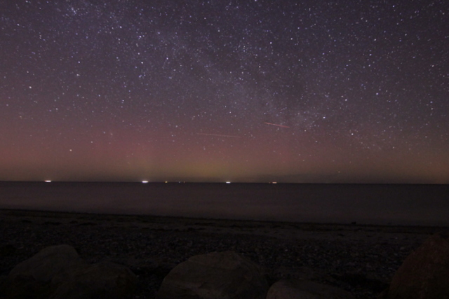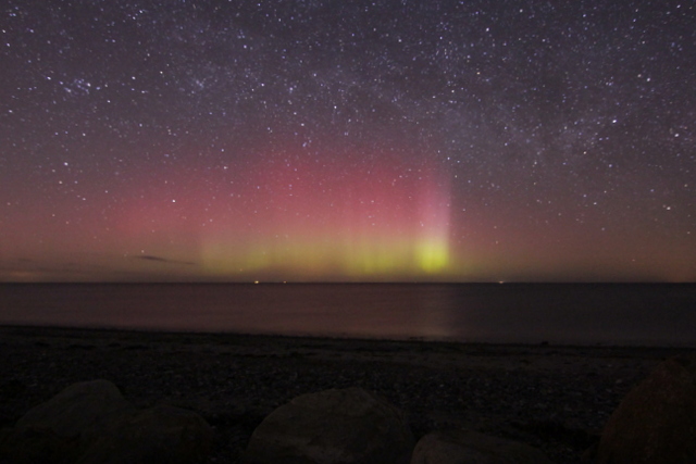 Begeistert bin ich immernoch vom "Finale" 23:15-23-45 UTC. War - wie Jörg - schon am Einpacken...bis ich um 23:15 UTC eine deutliche Aushellung Richtung NNW sehen konnte. Sehr schnell entickelte sich daraus ein wandernder Vorhang, der einmal über den Nordhorizins Richtung NNO wanderte. Eine kurze Phase würde ich sogar als "hell" taxieren. Das Polarlicht spielgelte sich für das bloße Auge sichtbar im Wasser.
