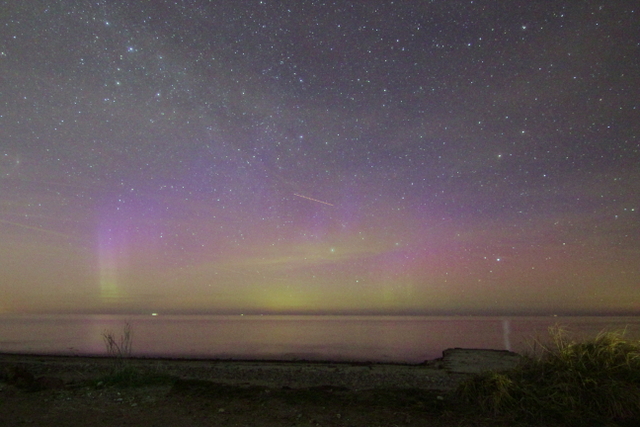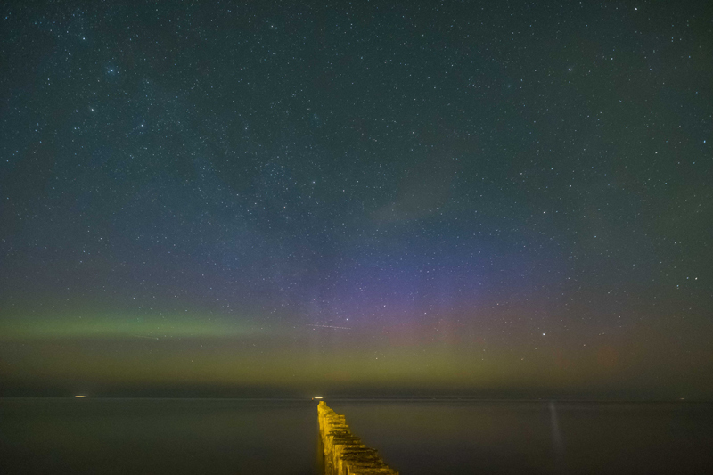 Hier ist noch ein Bild von 3:27 MESZ, als nochmals schwach visuell sichtbare Strahlen über den Horizont zogen. Ich konnte sie mit bloßem Auge bis fast zur Cassiopeia erkennen, also sogar den blauen Teil (Farben nahm ich keine wahr). Kurz danach war dann bei meiner Heizung die Batterie leer und als die Linse dann irgendwann beschlug, packte ich ein. Das Wetter war wohl mal wieder der entscheidende Faktor, es war ja sehr dunstig, neblig und feucht. Ich hab mich deshalb für Fehmarn entschieden, weil dort extrem wenig Lichtverschmutzung stört - und im Dunst gestreut werden kann.