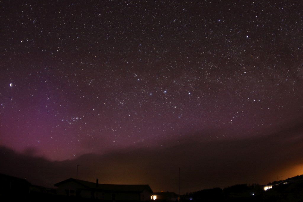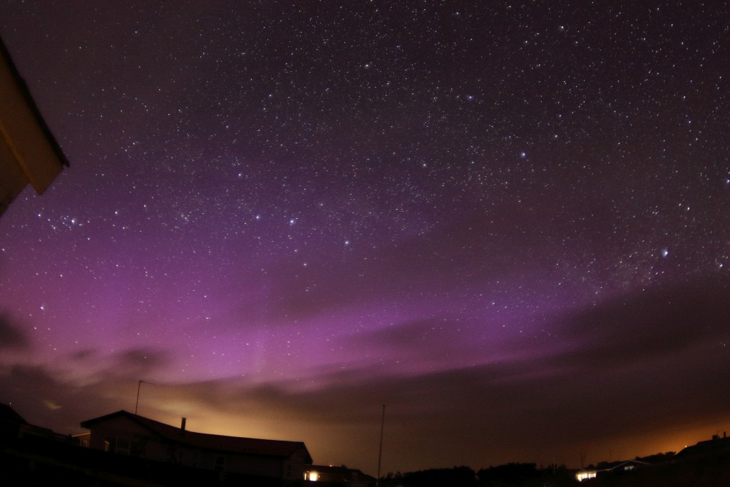 Der homogene Bogen war gleich zum Ende der astronomischen Dämmerung hin (gegen 23:30 MESZ) deutlich zu erkennen. Während der kurzen, aktiven Phasen waren Lichtknoten und Strahlen beeindruckend, jedoch farblos.