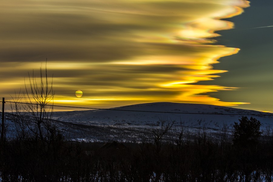 "Wir waren zu dieser Zeit Langlaufen auf dem See Äkaslompolo --kleiner Langlaufkurs. Leider hatte ich nur das Handy dabei. Später war ds Ereignis schon vorbei (CANON) Auffallend starker Föhn, wie uns die Guides mitteilten. Kommt eher selten vor da oben. Relativ warm zu dieser Zeit so um die Null grad und tags schon mal um die 10°C."