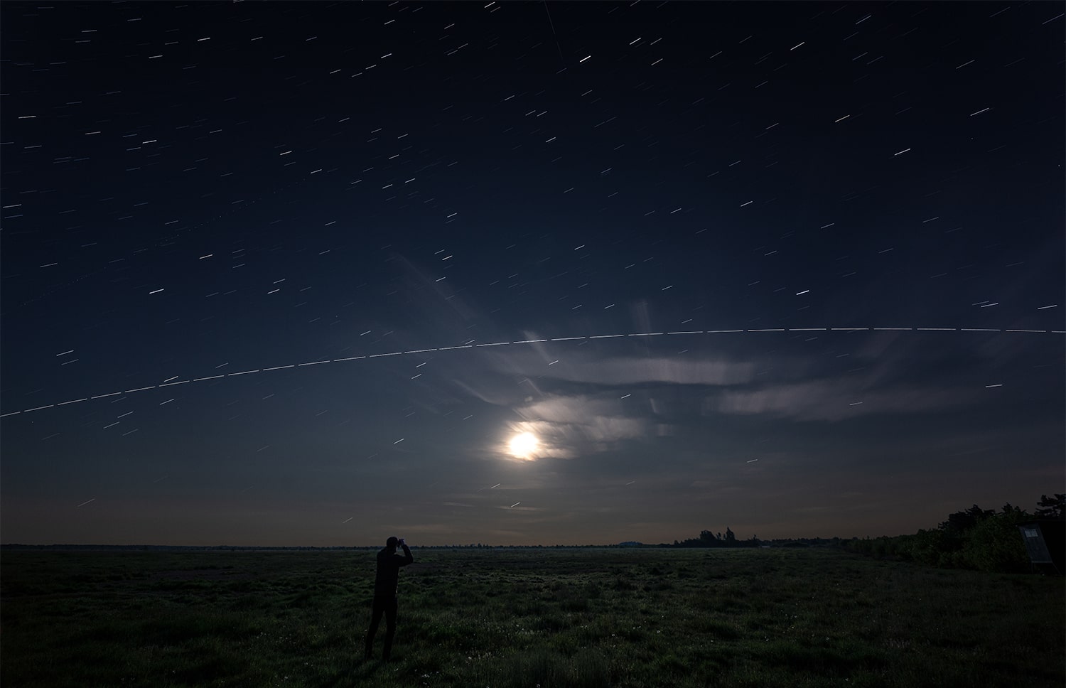 Ich war gestern Abend und Nacht mit meinem 12x56-Feldstecher unterwegs, um in der Dämmerung die Natur und den Vollmond zu beobachten. In weiser Voraussicht habe ich meine 6D mit 15mm-Linse eingepackt und den ISS-Überflug um 22:53 MESZ (Standort: Wehrblecker Heide) mit einer Reihenaufnahme festgehalten. Die Aufnahmen habe ich via Photoshop zusammengefügt und das Ergebnis auf eine Vordergrund-Aufnahme reduziert: