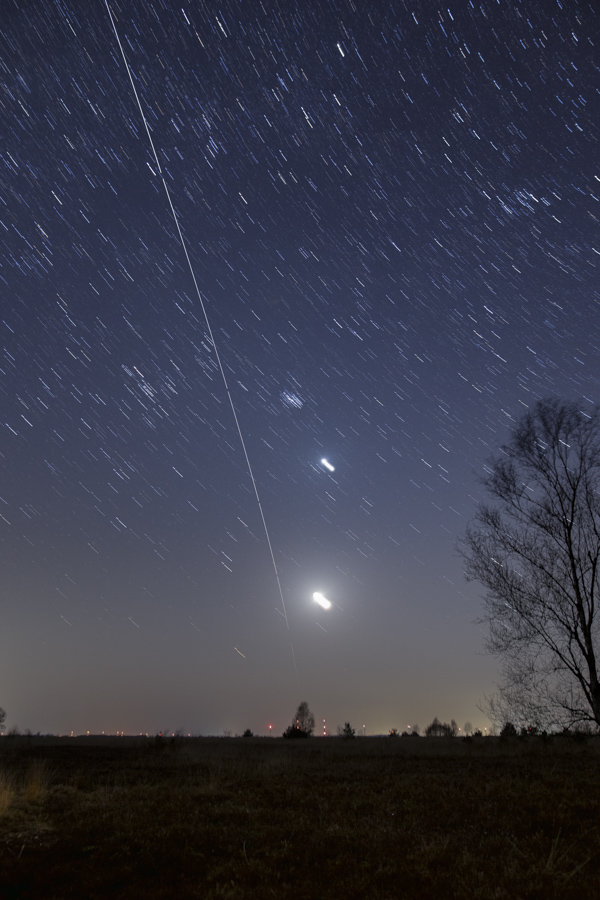 Ich war gestern Abend und Nacht mit meinem 12x56-Feldstecher unterwegs, um in der Dämmerung die Natur und den Vollmond zu beobachten. In weiser Voraussicht habe ich meine 6D mit 15mm-Linse eingepackt und den ISS-Überflug um 22:53 MESZ (Standort: Wehrblecker Heide) mit einer Reihenaufnahme festgehalten. Die Aufnahmen habe ich via Photoshop zusammengefügt und das Ergebnis auf eine Vordergrund-Aufnahme reduziert: