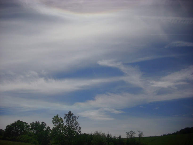 Wir haben momentan eine Baustelle irgendwo bei Neuhaus am Rennweg. Heute waren auch viele verdächtig aussehende Cirren am Himmel aber Halos gab es zuerst nicht. Erst gegen 12:30 gab es dann einen unvollständigen 22° Ring der mit der Zeit in allen Bereichen sich mal zeigte. Gegen 13:40 ist mir dann auch der ZHB am Horizont aufgefallen, zumindest in einer Kondensstreifen Cirre. Es zeigte sich ein sehr deutliches rot. Ich habe noch überlegt ob Infralateralbogen oder ZHB aber ich tippe mal eher auf ZHB. Später gab es noch in einer "Mini-Cirre" ein Stück des Horizontalkreises Nebensonnen konnte ich aber keine sehen. Ab 17 Uhr war keine Haloaktivität mehr. Bilder gibts keine muss ja auch noch was arbeiten.