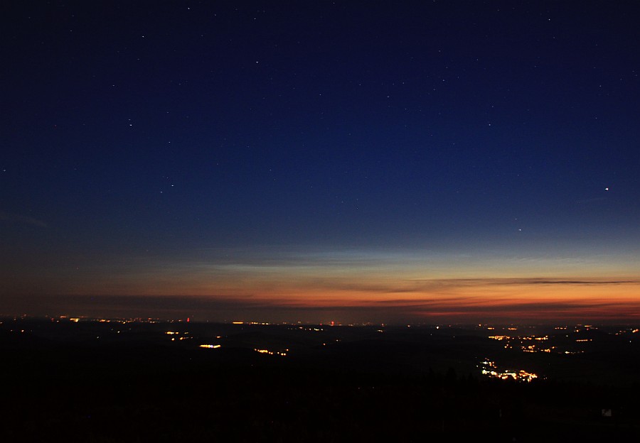hier eine Belegaufnahme aus Bonn mit den NLCs im dichten Schmodder über dem Horizont, aufgenommen um 03:02 MESZ. Danach war der Akku leer. Nach notdürftiger Aufladung des selbigen war ich um 03:42 MESZ wieder am Rheinufer - da war von den NLCs bei einer Sonnendepression von etwa -10° bereits nichts mehr zu sehen.