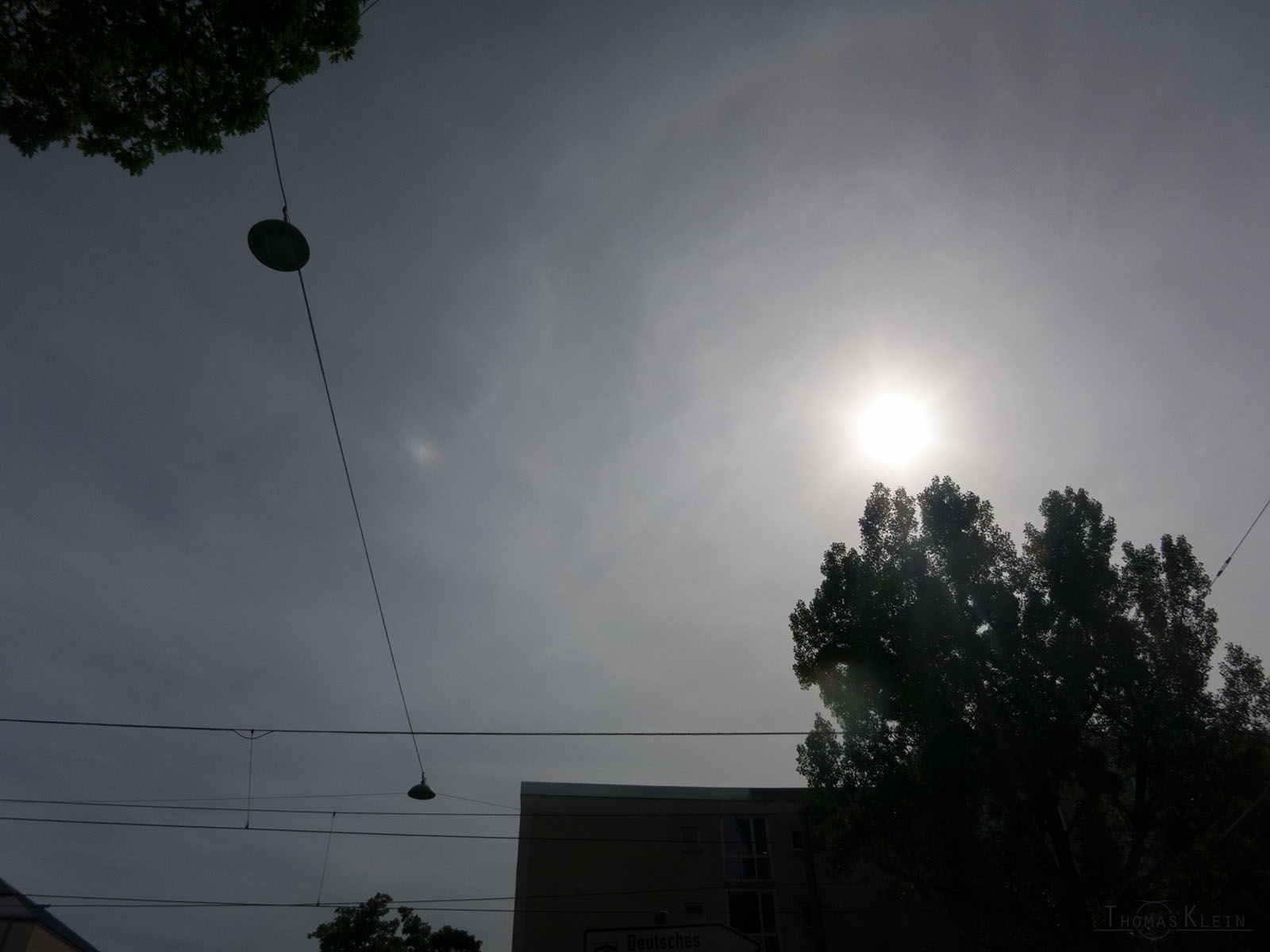 Nach der Vorlesung bin ich also raus auf die "Terrasse" der Hochschule gegangen um zu sehen, ob es denn Halos gibt. Im ersten Moment war alles blenden hell und auf den ersten Blick waren keine Halos zu sehen. Ich bin schließlich ein paar Meter weitergegangen, bis die Augen mit der Helligkeit besser klargekommen sind und habe nochmal einen Blick nach oben geworfen. Nach genauem hinsehen habe ich schließlich eine leichte Färbung in der ZHB Region gesehen, ein klassischer homöopathischer ZHB. Also habe ich meine Digitalkamera seit langem mal wieder aus meinem Rucksack gekramt und wollte Bilder machen, wer weiß, wie lange sich der ZHB hält. ...und dann kam es, Akku leer! Aber macht ja nichts, ich habe 4 Akkus für die kleine Kamera. Doch auch der zweite und dritte Akku wollten nicht so recht. Als letztes habe ich schließlich den originallen Akku probiert und der hatte noch Saft, was für ein Glück!