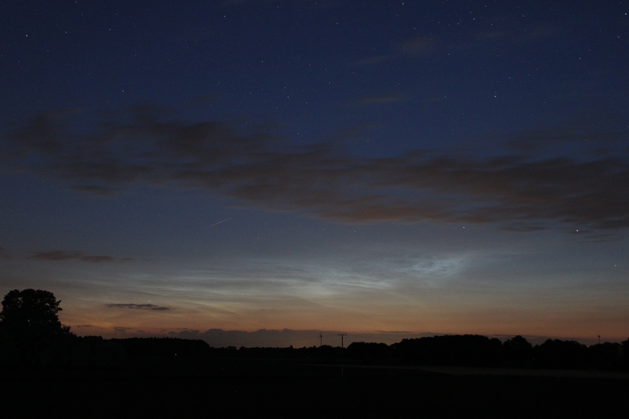 auch bei Bremerhaven nördlich von Schiffdorf waren die NLC gut sichtbar. Mein erster fotografischer Nachweis ist von 23:35 MESZ. Zu der Zeit gab es NLC-Strukturen im Westen und Nordwesten. Kurz darauf wurden sie auch visuell sichtbar. Die NLC hatten auch bei mir eine Helligkeit von 3 und waren wunderschön strukturiert. Meine erste Sichtung der Saison.