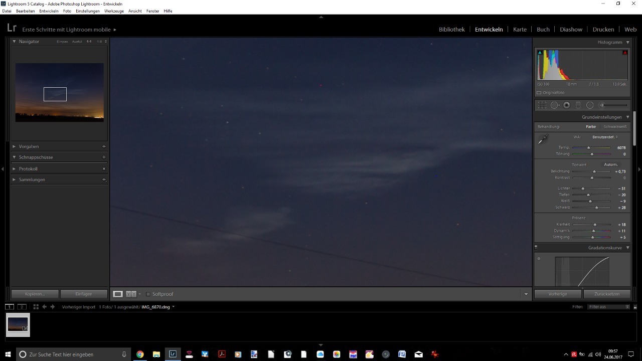 Am vergangenen Abend, am 23.06 waren keine NLCs auszumachen. Weder mit dem Fernglas, noch am PC. Zu viel Dunst und dunkle langgezogene ci in Horizontnähe. Entschädigt wurde ich heute in der Früh mit einem ausgedehnten NLC-Feld. Am Beobachtungsort angekommen war klar, hier verpasse ich einen großen Teil. Schnell in den Pkw und ein paar Km weiter zu meinem doch eher selten aufgesuchten Beobachtungsort. Ich fahre zwar ungern in der Nacht herum, aber heute hat es sich gelohnt, da ich hier einen ungestörten Blick von NNW bis über O habe. Hier die Fakten: