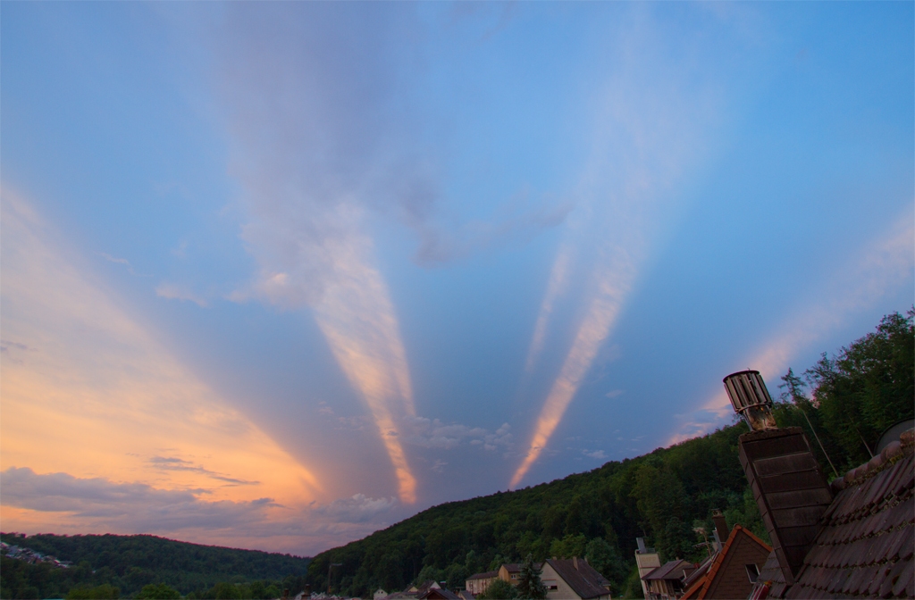 gestern Abend gab es nach Durchzug eines Gewitterchens (kleiner kann man es nicht weiter verniedlichen) mega mäßige Gegendämmerungsstrahlen bzw. Schattenwürfe wie ich sie selten gesehen habe (ich glaub so noch nie!). Leider war ich zu diesem Zeitpunkt nicht auf meinem Hausberg, könnte mir grad in den Ar... beißen, das hätte bestimmt ´n mega Panorama gegeben. Hätte, hätte....