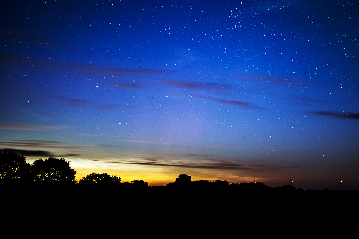 zwischen 1:00 und 1:40 MESZ war es hier dunkel genug, dass zumindest ein bisschen violettes, diffuses Polarlicht zu fotografieren war. Visuell ließ sich das nicht von der Dämmerung unterscheiden. Standort: bei Dornsode, ca. 30 km östlich von Bremerhaven.