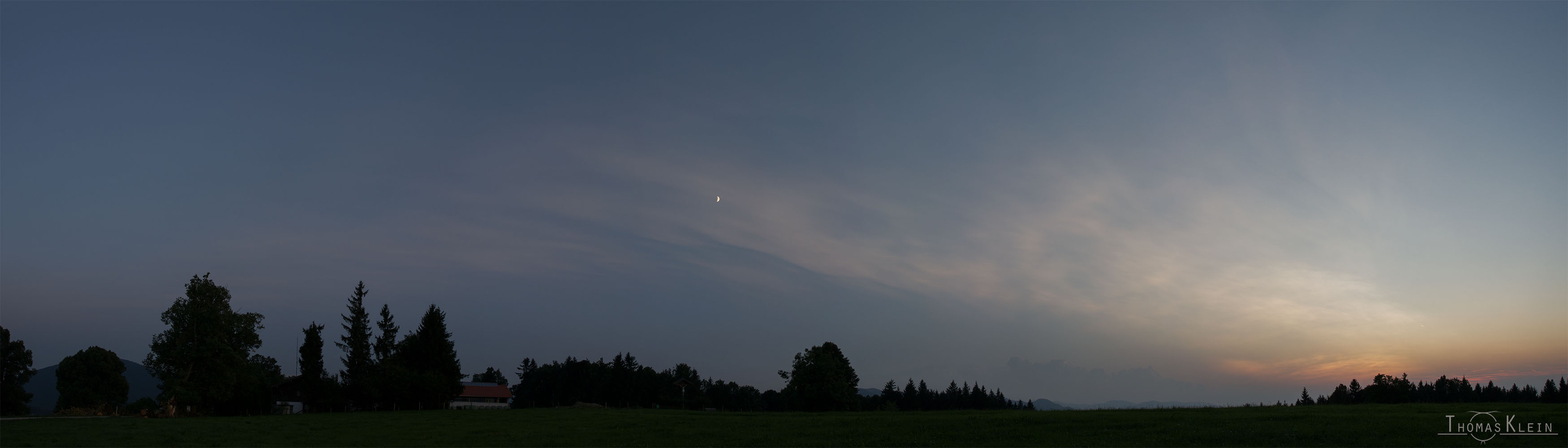 Kurz vor Sonnenaufgang erreichten die "Pseudo-NLC" ihre größte Ausdehnung. Allerdings wurde ihnen die Show von dem nun allmählich ins direkte Sonnenlicht geratenden Cirrus gestohlen. Wegen der wirren Struktur tippe ich mal auf Cirrus intortus...
