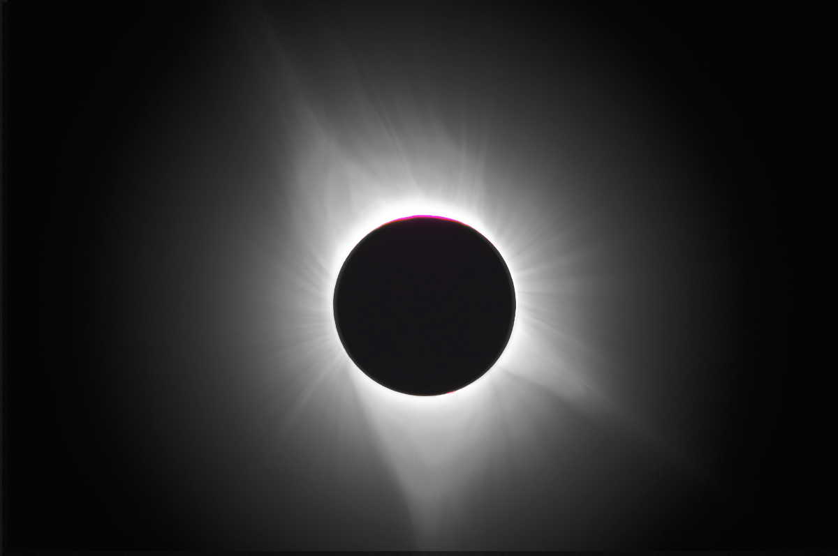 Hier die mittels unscharfer Maske (radialer Weichzeichner mit Methode "kreisförmig", 20°-Winkel) herausgearbeitete Struktur der Korona (als Luminanzebene im ersten Bild verwendet)