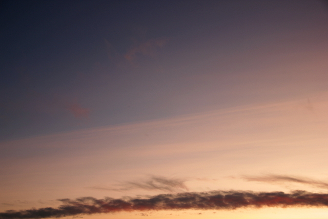 Heute abend kurz nach Sonnenuntergang waren wieder die "Streifenwolken" zu sehen. Allerdings haben sie sich, im Gegensatz zum vorhergehenden Mal, verändert und sind eine Weile am Himmel "stehengeblieben". Es machte auf mich als Laie kurz den Eindruck, als ob es sich doch um "Schleierbewölkung" (wie bereits hier vermutet: Cirrostratus) handeln könnte.