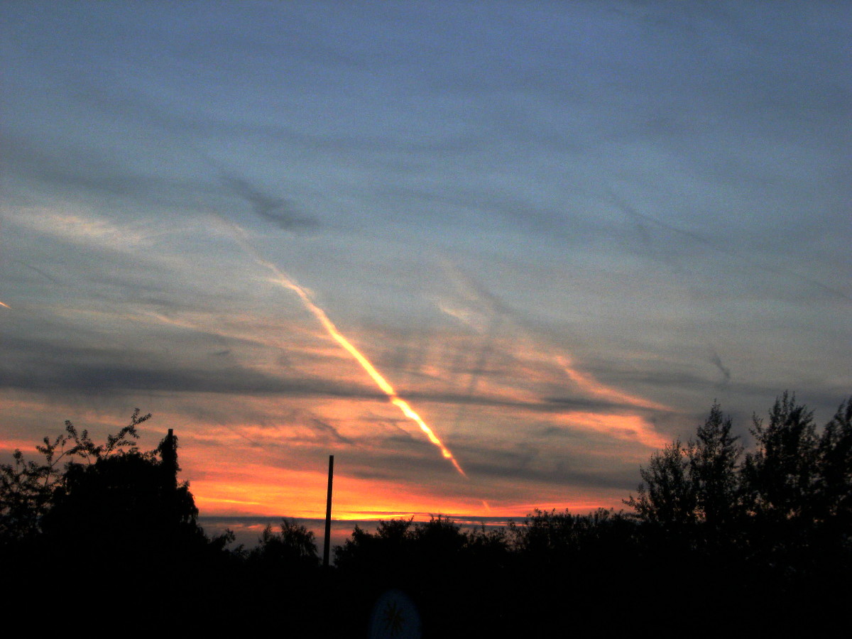 Wolkenstrahlen an einem Kondensstreifen, gestern abend in Duisburg: